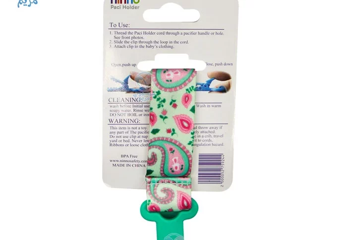 بند پستانک نینو از پارچه نرم و ضدحساسیت تولید شده که در تماس با پوست لطیف کودک هیچگونه تحریک یا سوزشی ایجاد نمیکند. این بند دارای یک گیره پلاستیکی محکم است که به راحتی به لباس نوزاد متصل میشود و بدون آسیبرساندن به پارچه، پستانک را در جای خود نگه میدارد. در انتهای بند نیز حلقهای کوتاه قرار دارد که برای اتصال آسان به پستانک طراحی شده است.