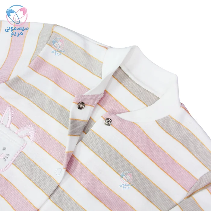 سرهمی طرح خرگوش از برند ایرانی آشور است. طرح این لباس راه راه افقی است و رنگبندی آن بسیار روشن و ملایم است. این سرهمی مدل دخترانه است و از قسمت یقه لباس تا فاق دارای دکمه است. از این رو تعویض لباس و پوشک نوزاد به راحتی انجام میشود. از دیگر ویژگیهای این محصول، میتوان به موارد زیر اشاره کرد: