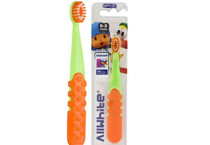 زمان استفاده از مسواک، ابتدا مقدار مناسبی از خمیر دندان کودک را روی قسمت رنگی مسواک بریزید و به آرامی شروع به مسواک زدن دندان کودکتان کنید.