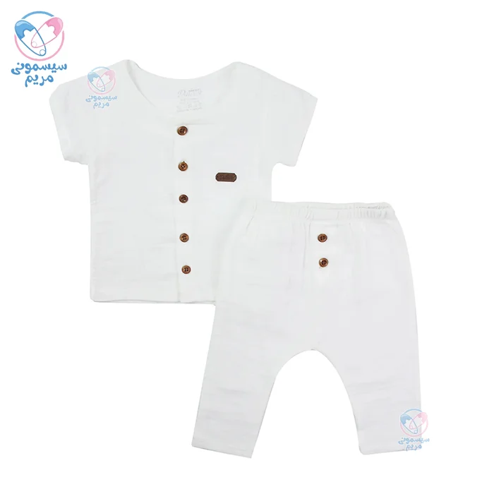 جنس بلوز و شلوار فوق از نخپنبه است. جنس این لباس، دارای تنفسپذیری، کنترل رطوبت، لطافت و نرمی بینظیری است. بهعلاوه این جنس از پارچه سازگاری زیادی با پوستهای حساس دارد، از این رو از حساسیت پوستی کودکان جلوگیری میکند.