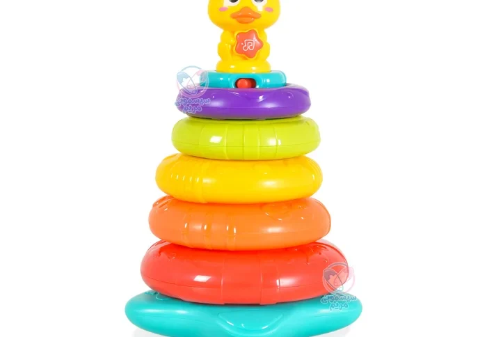- دارای 5 حلقه رنگی با ابعاد مختلف است که به کودک امکان میدهد تا به سادگی آنها را روی پایه اردک قرار دهد. این حلقهها به تقویت مهارتهای حرکتی کمک میکنند؛