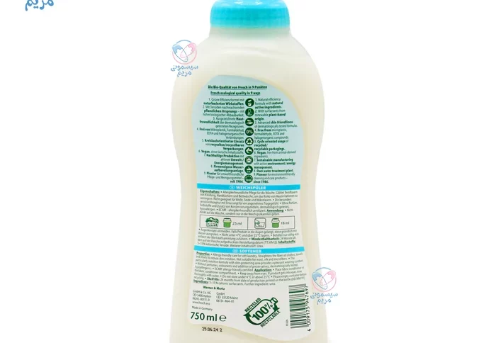 | روش مصرف | برای پارچههای حولهای و پنبه ۳۵ میلیلیتر, برای مخلوط پارچه و پارچه پشمی ۲۵ میلیلیتر و برای پارچههای با الیاف مصنوعی و شستشوی دستی البسه ۱۸ میلیلیتر از مایع را در ۱۰ لیتر آب به همراه مایع لباسشویی حل کنید و سپس البسه را شستشو دهید. |