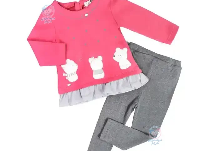 - این ست زیبا در دو رنگ طوسی و صورتی عرضه میشود. ترکیب این دو رنگ به خلق ظاهری دلنشین و جذاب کمک کرده و بهراحتی با سایر لباسهای کودک هماهنگ میشود؛