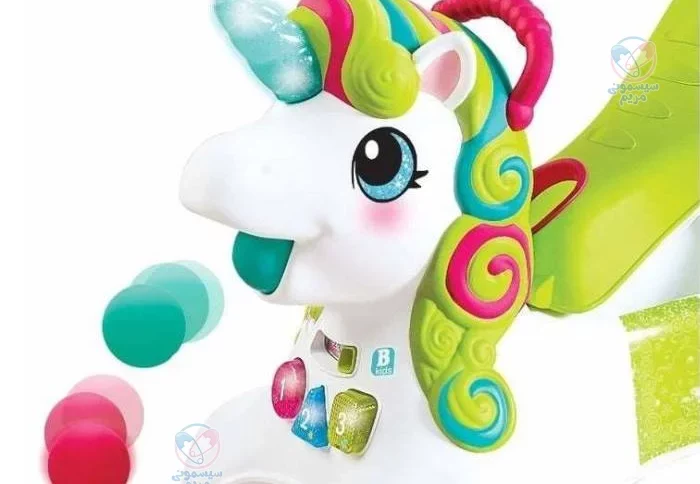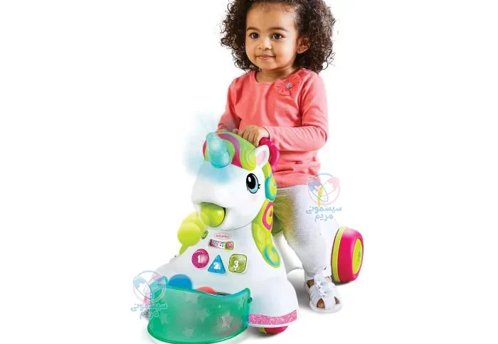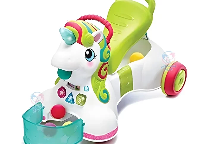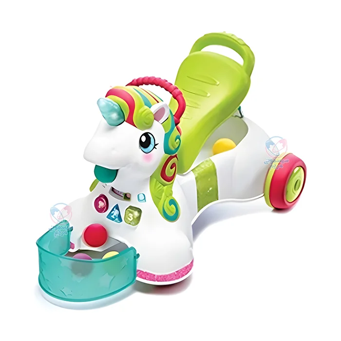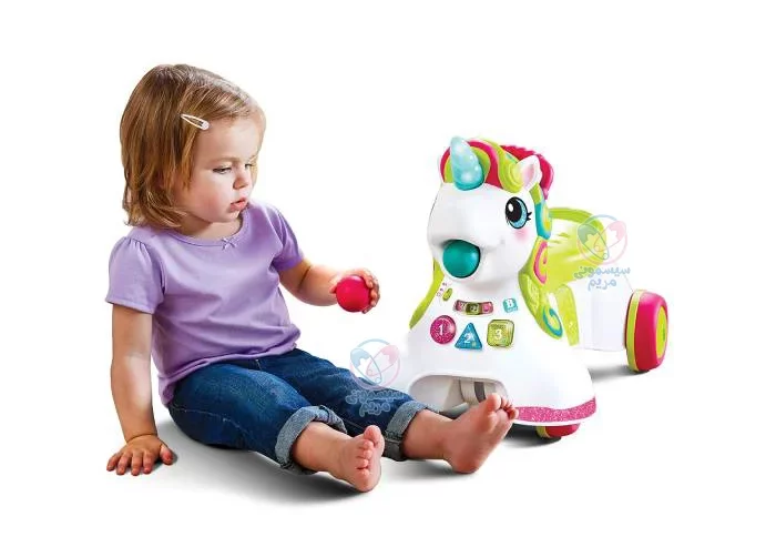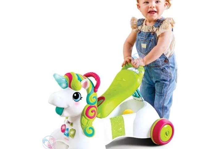 این محصول مجهز به پنل موزیکال است که صداهای گوناگونی از آن پخش میشود. چراغ چشمک نیز یکی دیگر از ویژگیهای جالب این واکر است. واکر یونیکورن دارای پنج توپ رنگی با قابلیت پرتاب از دهان اسب و جمع کردن توپها است. از دیگر ویژگیهای این محصول قابل تبدیل شدن آن به ماشین چهارچرخ است که چرخهای آن کاملاً ضد لغزش بوده و به دلیل داشتن لبههای گرد، ایمنی بالایی دارد.