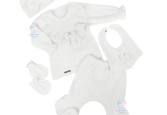 - محتویات متنوع: شامل پنج تکه از جمله بلوز دکمهدار، پیشبند، دستکش، شلوار جورابدار و کلاه که نیازهای مختلف نوزاد را برآورده میکند؛