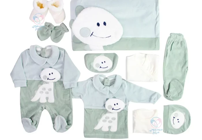 • پتو، کلاه، دستکش، پاپوش، بادی آستین بلند، شلوار جوراب‌دار