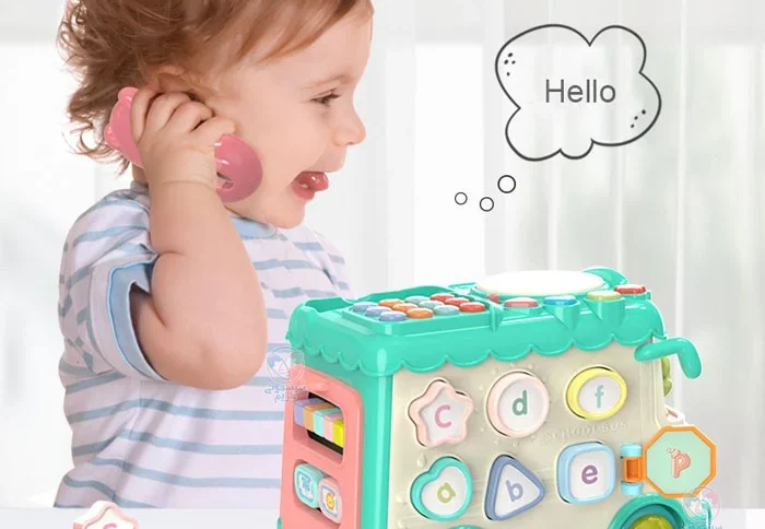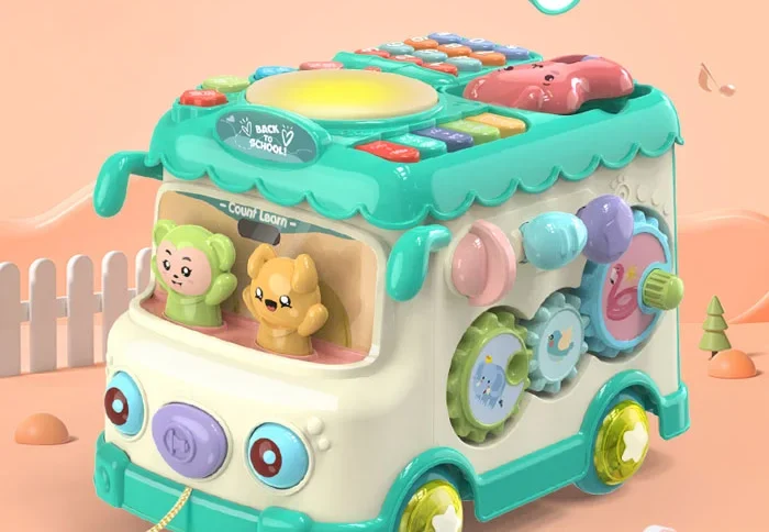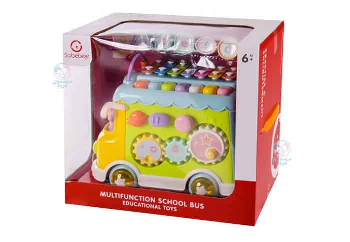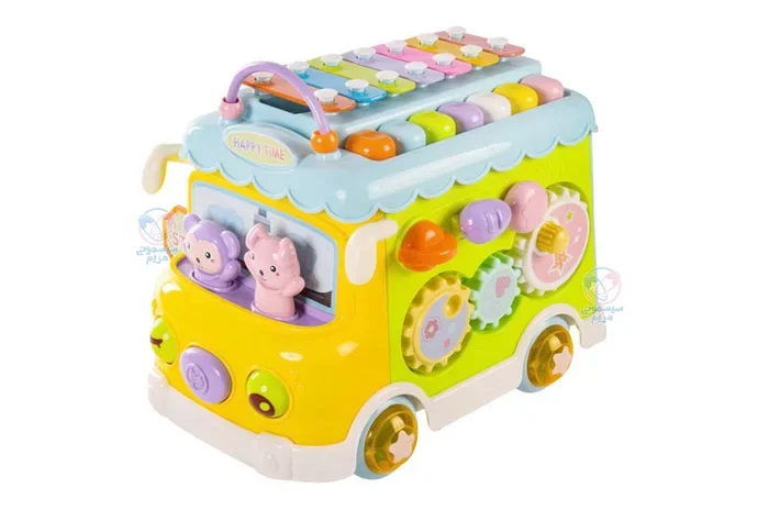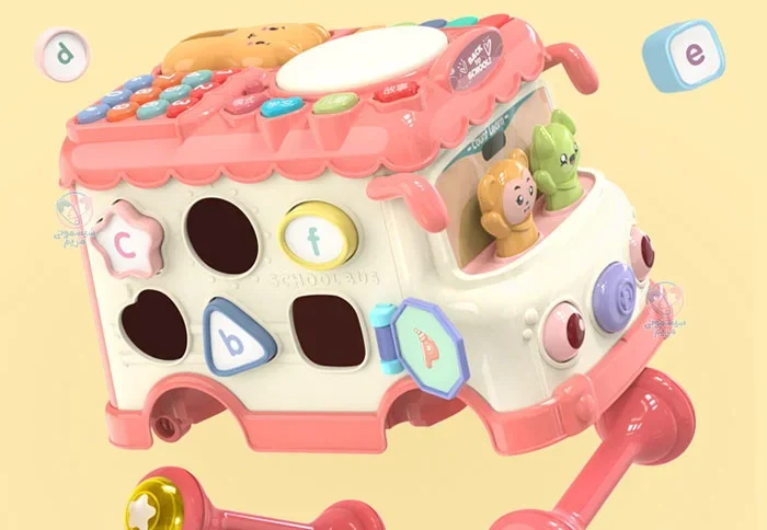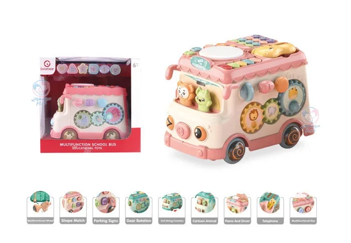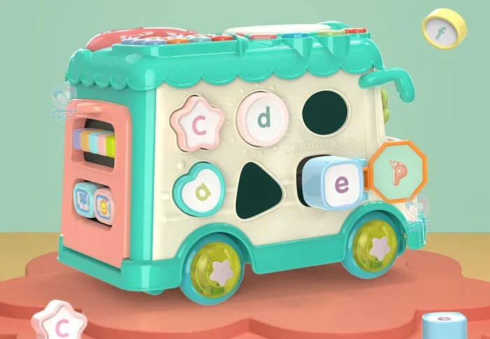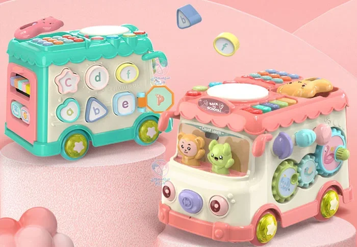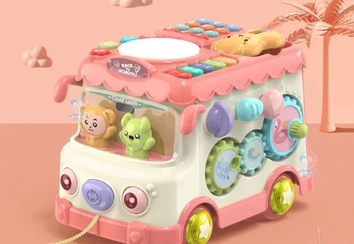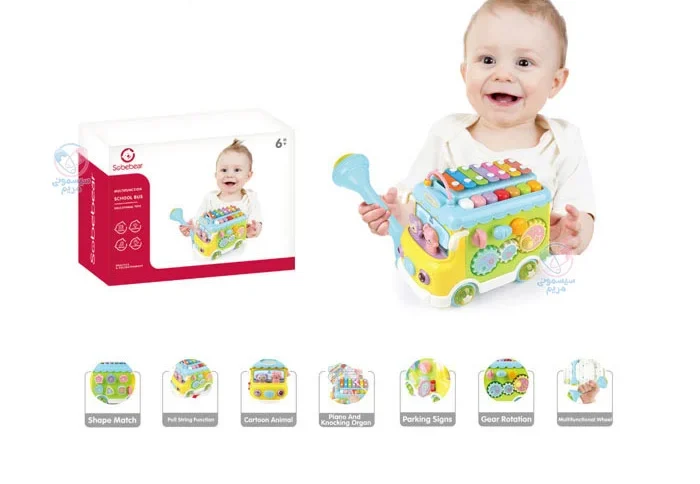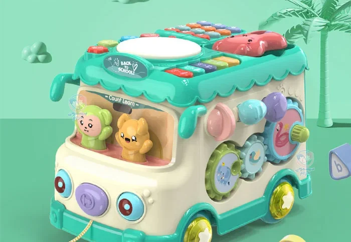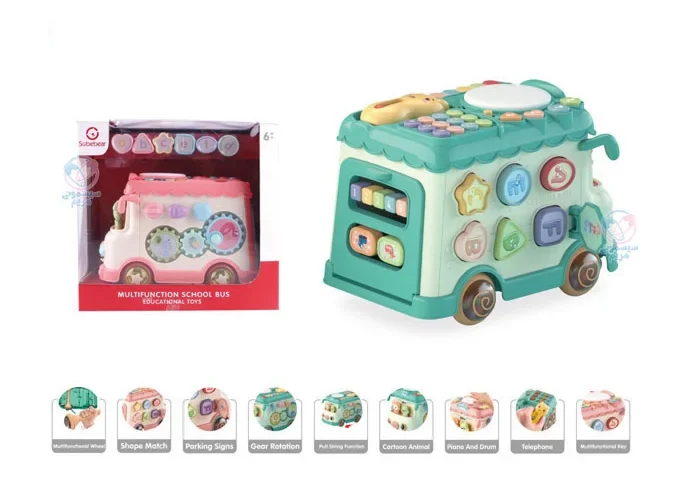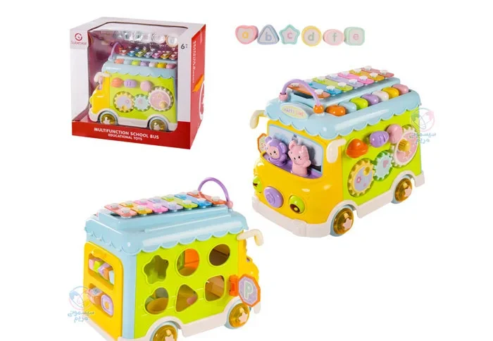 محصولی با اشکال، حروف، اعداد و بلوک‌های آموزشی، مجهز به چرخ دنده حرکتی، با قابلیت کشش اتوبوس به واسطه نخ و چرخ، پازل اشکال، تلفن اسباب‌بازی، پیانو و درام و حیوانات کارتونی